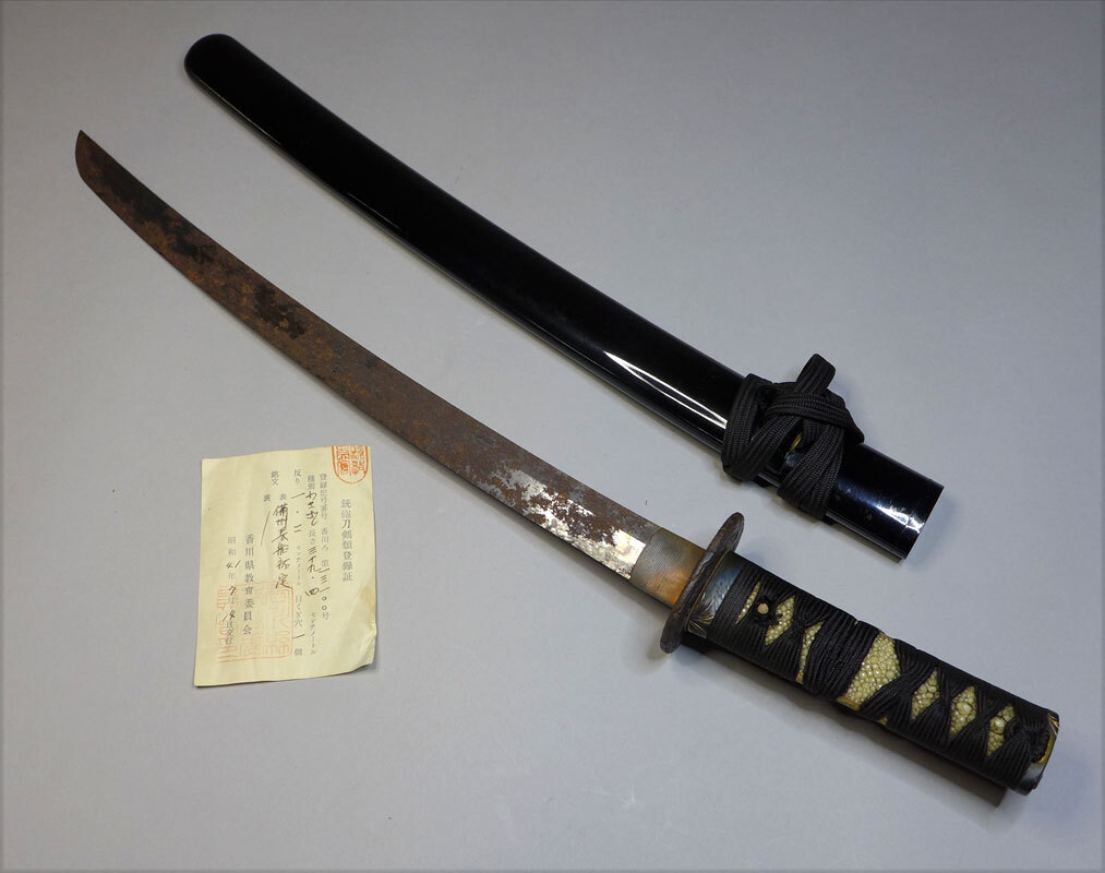 詳細サイズは画像の登録証をご覧下さい。時代武具です、必要な方どうぞ!写真の通り、サビなど見えます、ご了承ください。拵えは時代感はありますが悪い状態ではないと思います。状態は画像判断でお願いします。当方このような物に詳しくない為に詳細などは分かりかねます、ご了承の上お願いします。★★★落札者は、落札して購入後、銃砲刀剣類所持等取締法に もとづき都道府県の教育委員会に所有者変更の届出が必要です。★★★★★★★★★★★★★★★★★★★★★★★★★最近、悪質な入札者が多く非常に迷惑をしております。新規IDや「非常に悪い・悪い」の評価の多い方の入札はお断りさせて頂きます。 仮に入札があった場合でも、発見次第入札を削除させて頂く場合がございます(判断基準は弊社判断によります事予めご了承下さい)