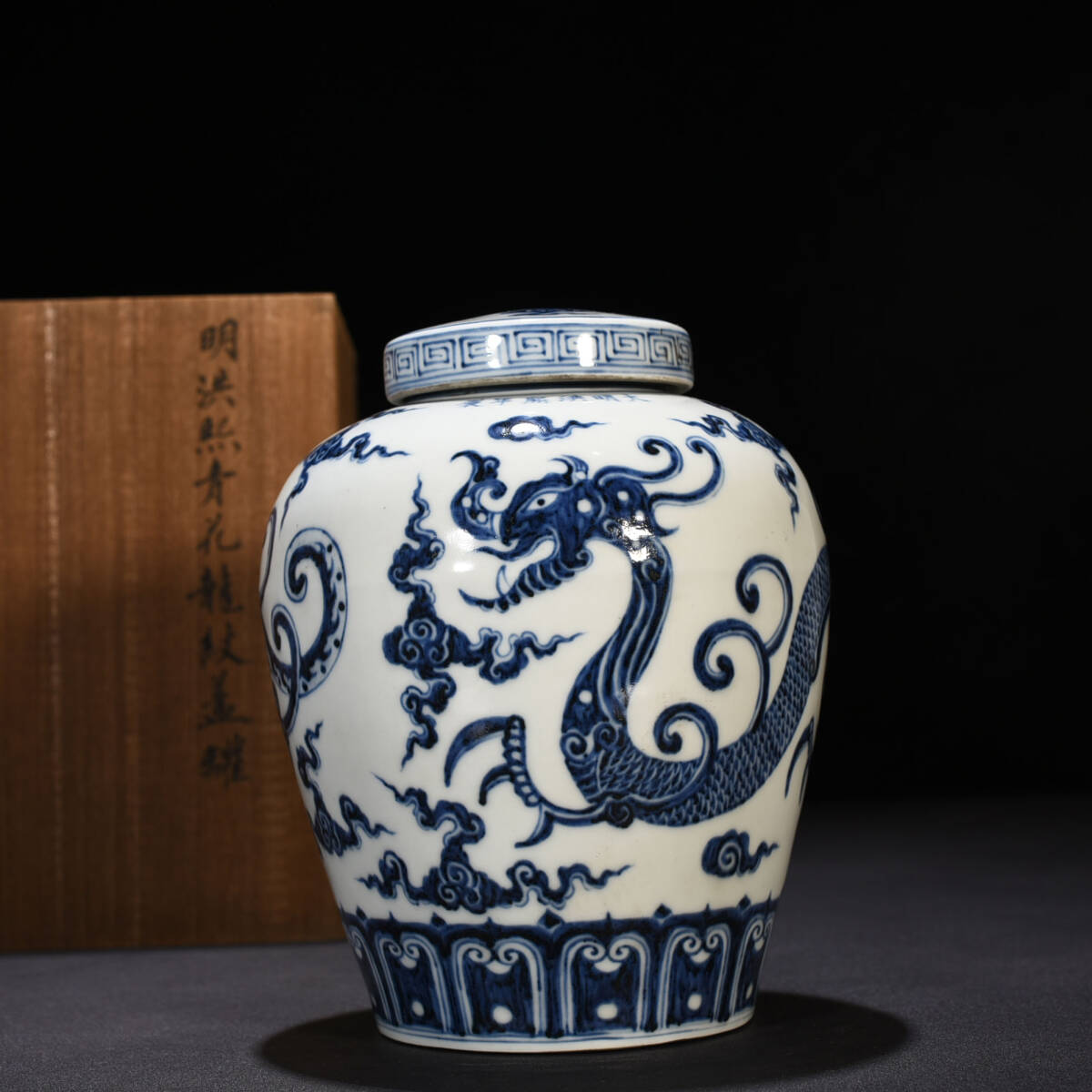 > ◆珍蔵◆中国古美術 大明洪熙年製 青花 古陶磁 龍紋盖罐 共箱 細密細工造 置物 擺件 古賞物 骨董品 時代物 A33