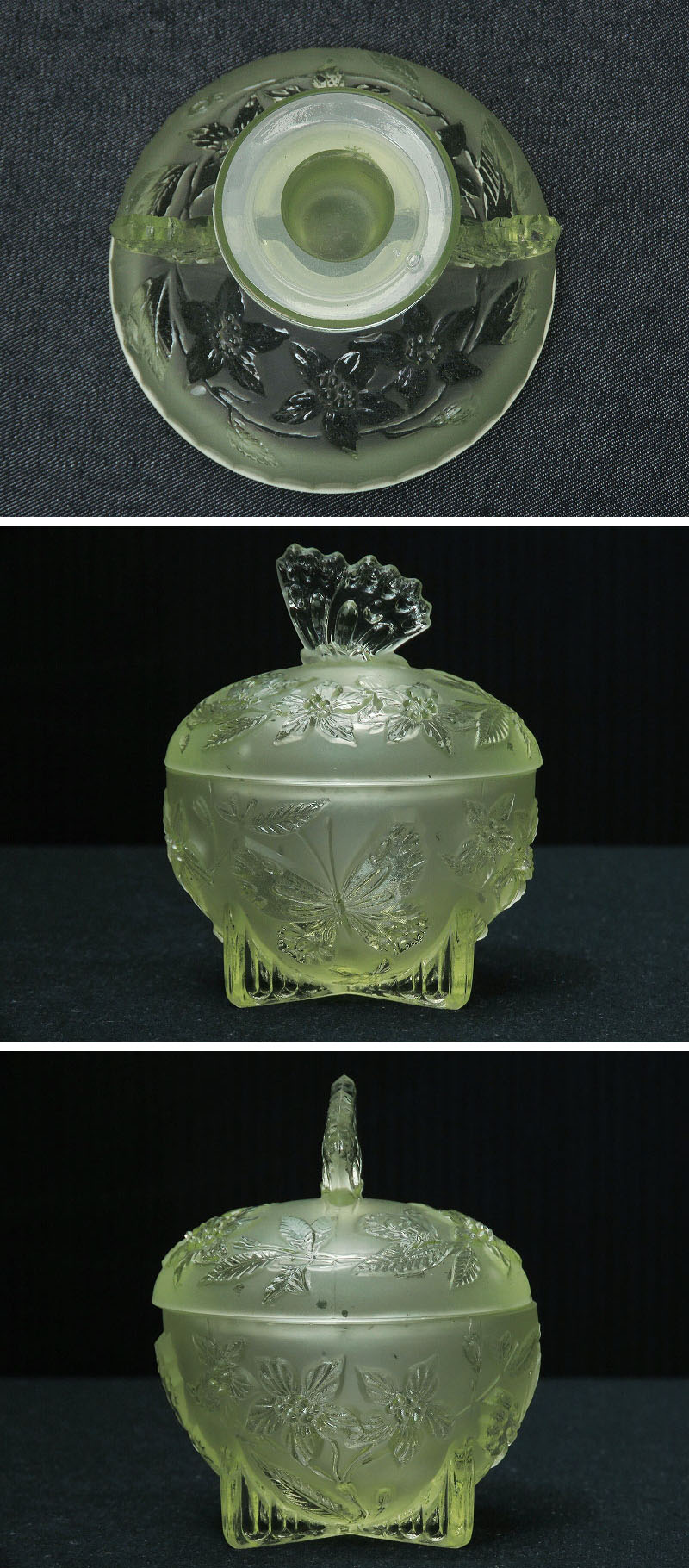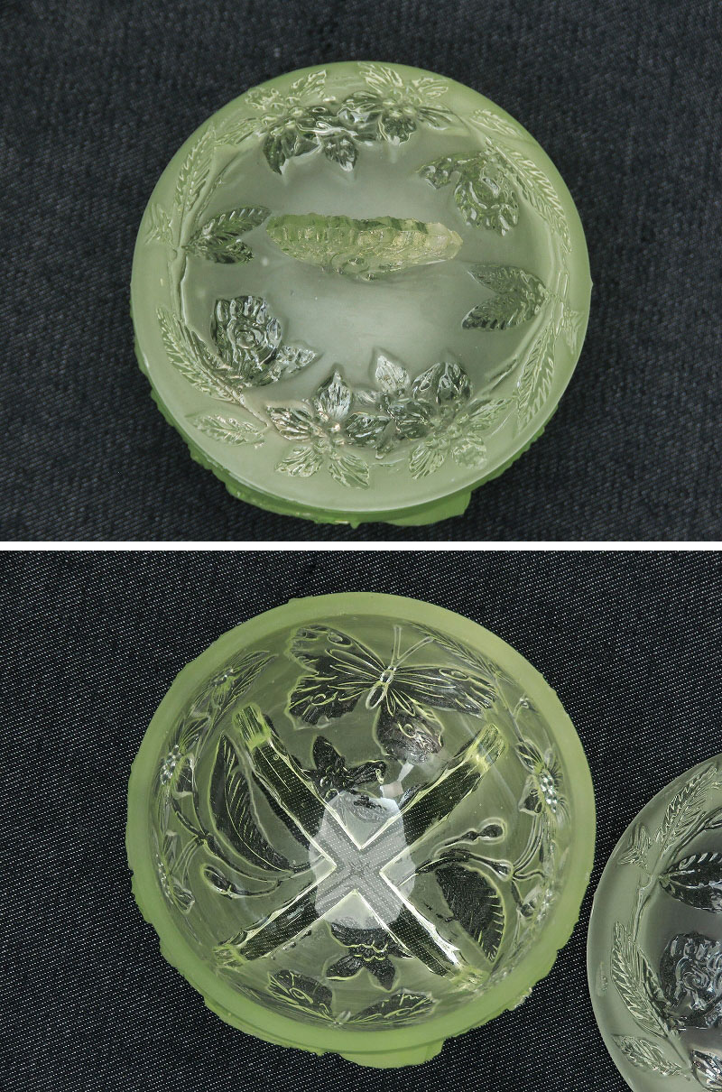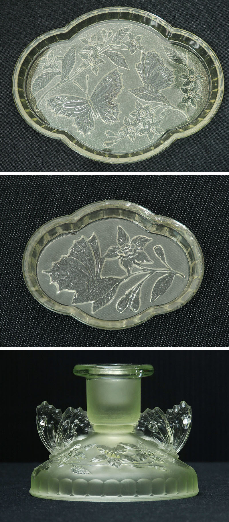 > 蝶と花がデザインされたウランガラスのドレッシングテーブルセット/ヴァセリンガラス/ディスプレイ/インテリア雑貨/AL-0656