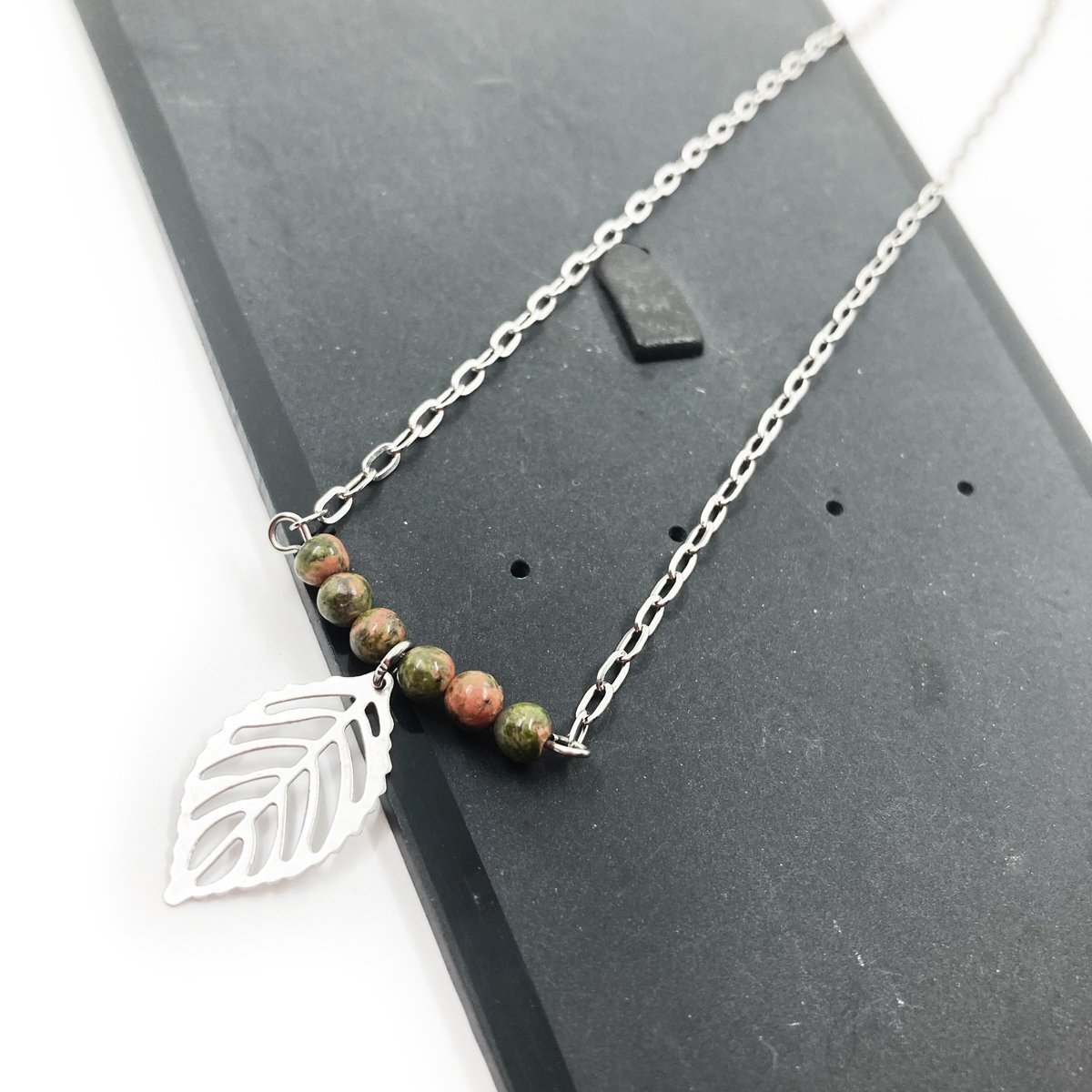 - 透かしリーフチャーム パワストーンステンレス ユナカイト 約4mm玉 ネックレス 2.5mm幅40cm ST79