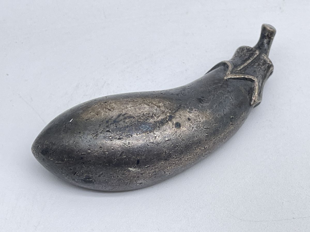 - 金属製 茄子文鎮 華石作 銘 古玩 伝統美術工芸[磁石はつきません]長8.5cm 185g 書道具 書家 書画 オブジェ ペーパーウエイト 文鎮(11757)