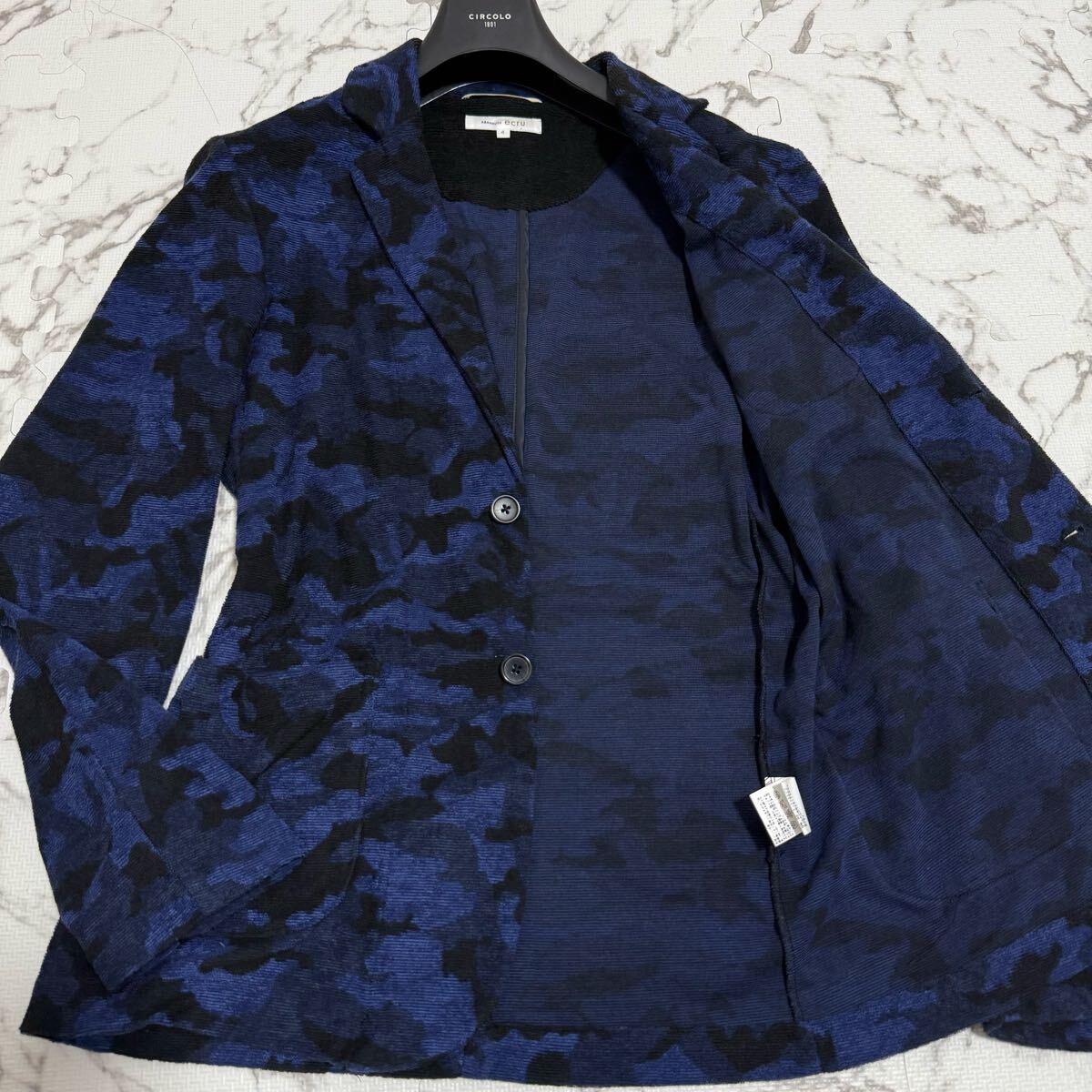 > 【極美品】XL!!アバハウス ABAHOUSE 迷彩 カモフラ テーラードジャケット メンズ ストレッチ アンコン 4 ブルー 青 タオル生地 お洒落