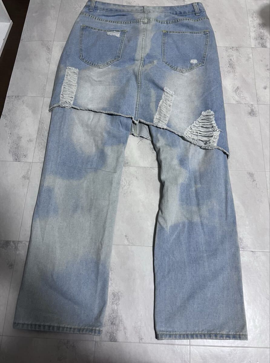 - デニムパンツ クラッシュ加工 スカート レイヤード 淡色 スカート付き 32インチ 個性的 メンズ