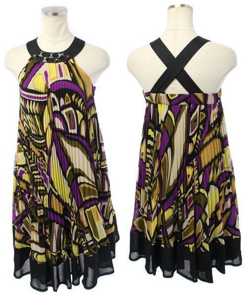 - GRACE CLASS プリント ノースリ プリーツ ワンピース 36 パープル イエロー グレース 紫 黄