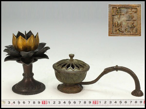 - 【金閣】仏教美術 銅 蓮花 持香炉 蓮燭台 二件 旧家蔵出 送料無料(LC970)