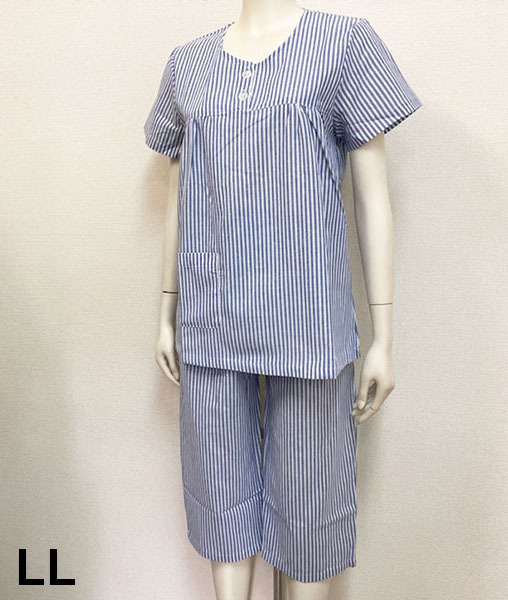 - 即決新品 半袖 7分パンツ 上下セット ルームウエア ストライプ ブルー LL セットアップ 送料無料