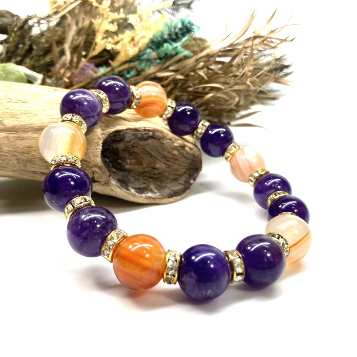 > カーネリアン・サードニクス 天眼石 &アメジスト パワーストーン ブレスレット 天然石 (ゴールド) 12mm メンズ・レディース 男性 女性