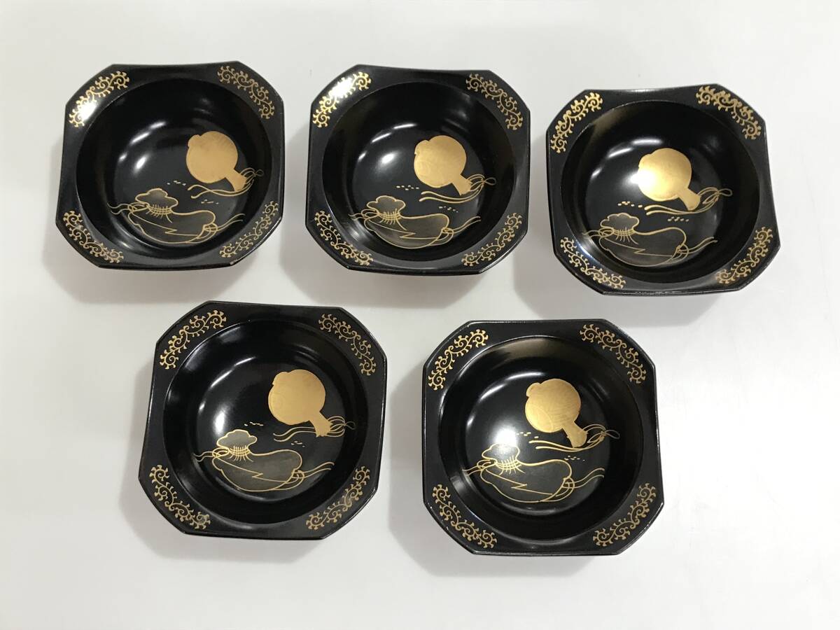 - HG8849 黒漆塗 金蒔絵 小鉢 5客 八角形? 小槌 寶袋 巾着 骨董 漆器 漆塗 小皿 向付 小鉢 割烹 料亭 和食 懐石
