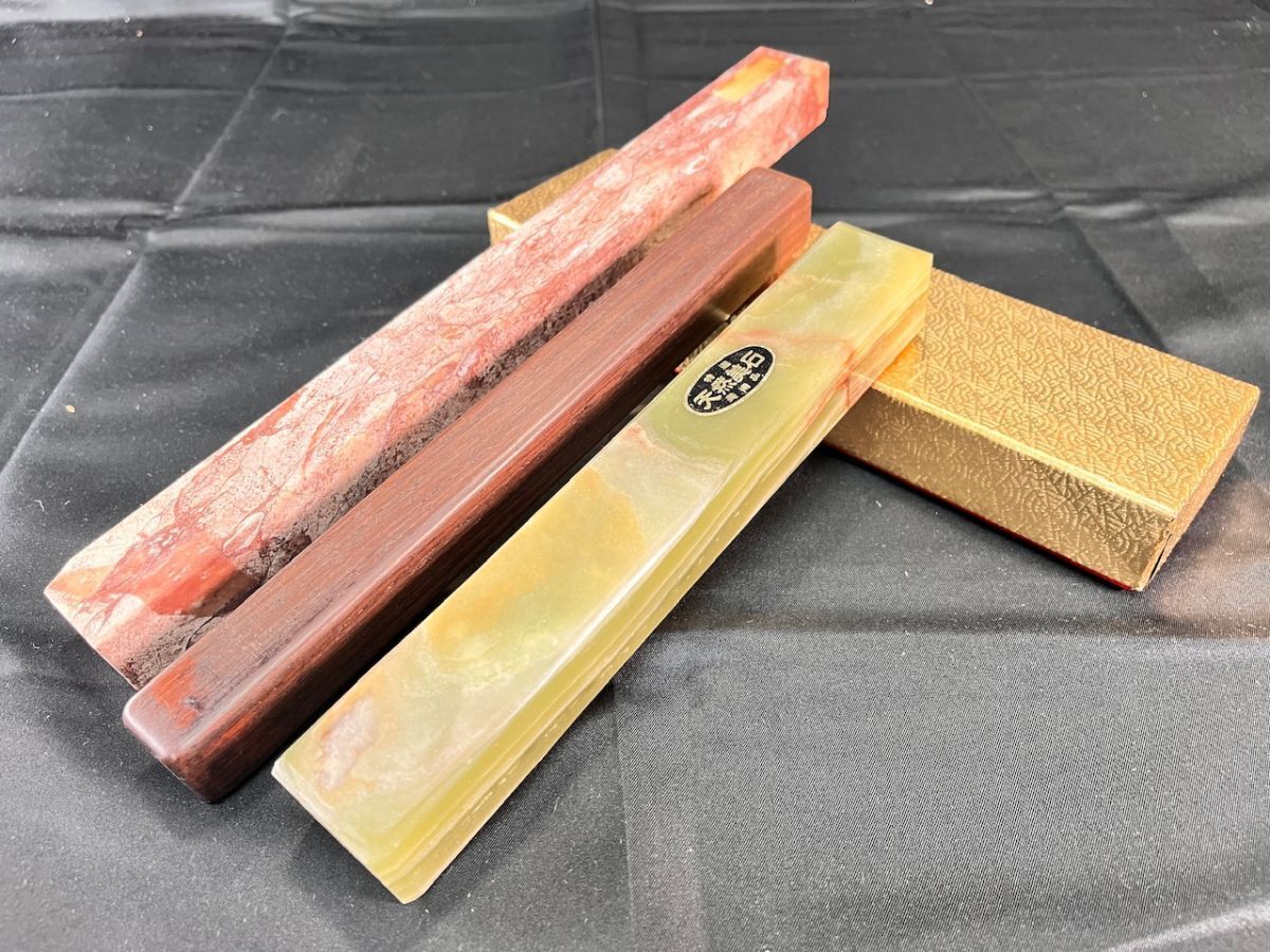 - 文鎮 3種 まとめ 天然石 赤 30×3×2㎝ 537g 木製文鎮 24×2.5×2㎝ 368g 特選 天然美石 美術品 21×4.5×2㎝ 491g 書道具 (14919)