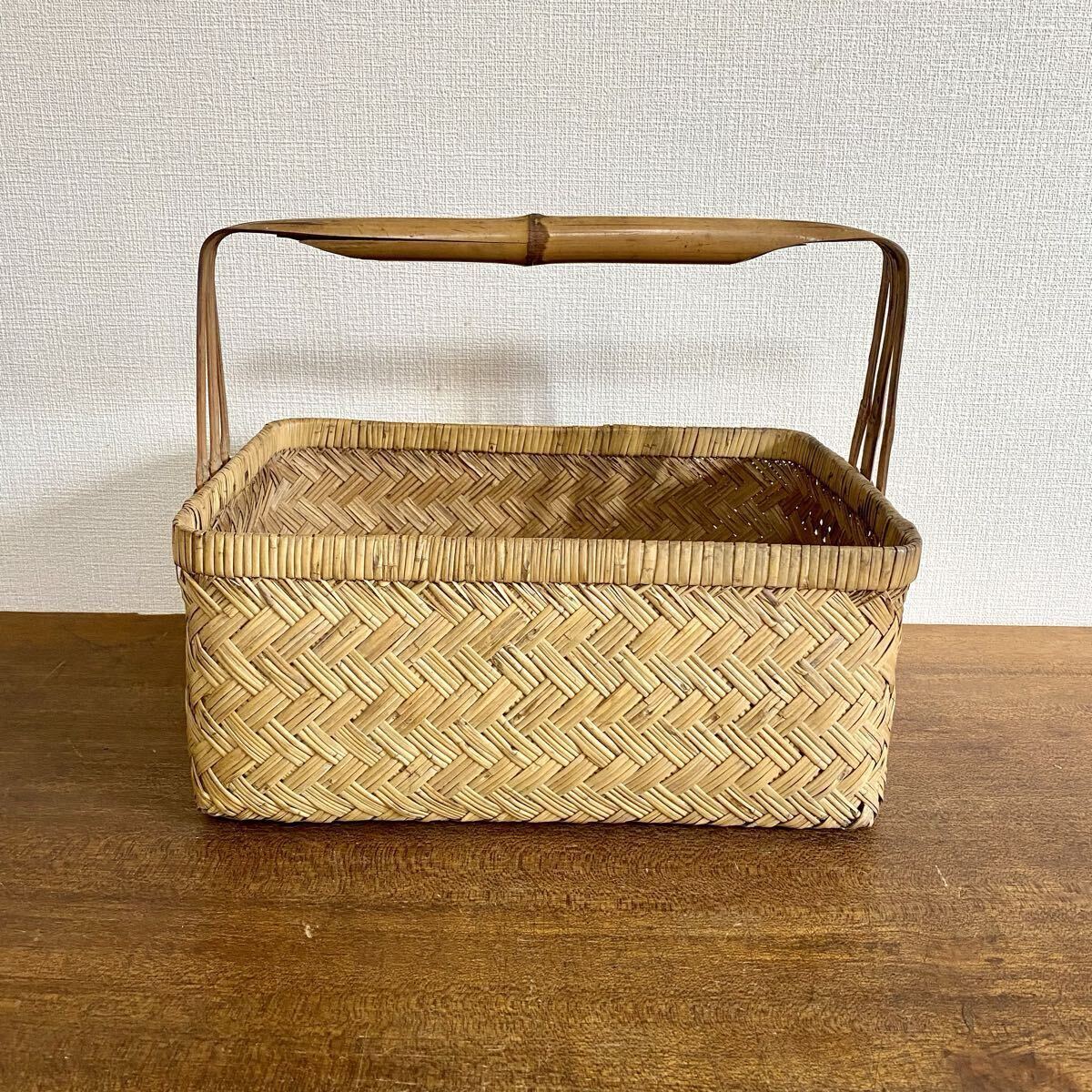 - 昭和レトロ 竹細工 竹籠 横幅約37.5㎝ / 竹カゴ 小物入れ バスケット 持ち手付き 古道具 当時物