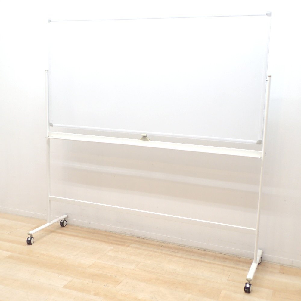 > 自立式ホワイトボード W1800 H900 白板 脚付 移動式 回転式 両面 ロック式キャスター ペントレー 会議 セミナー KK18021 中古オフィス家具