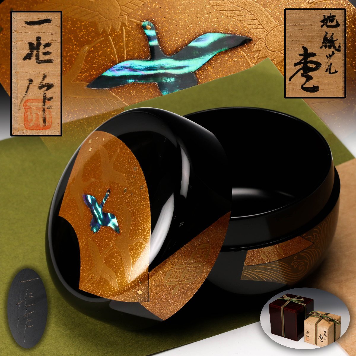 【佳香】一后一兆 地紙ツル棗 共箱 二重箱 共布 栞 茶道具 本物保証
