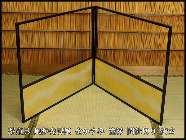 - 【銀閣】茶道具 風炉先屏風 金かすみ 塗縁 間仕切り 衝立 旧家蔵出 送料無料(A475)