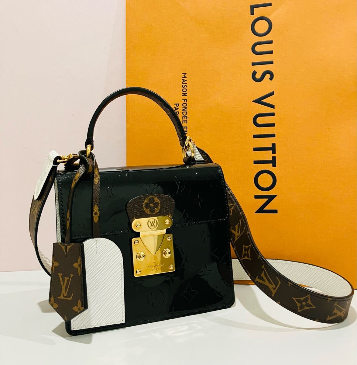 > LOUIS VUITTON 新品同様 ブラック × ホワイトレザー バッグ ルイ・ヴィトン モノグラム 2way バック チャーム ショルダーストラップ 付属
