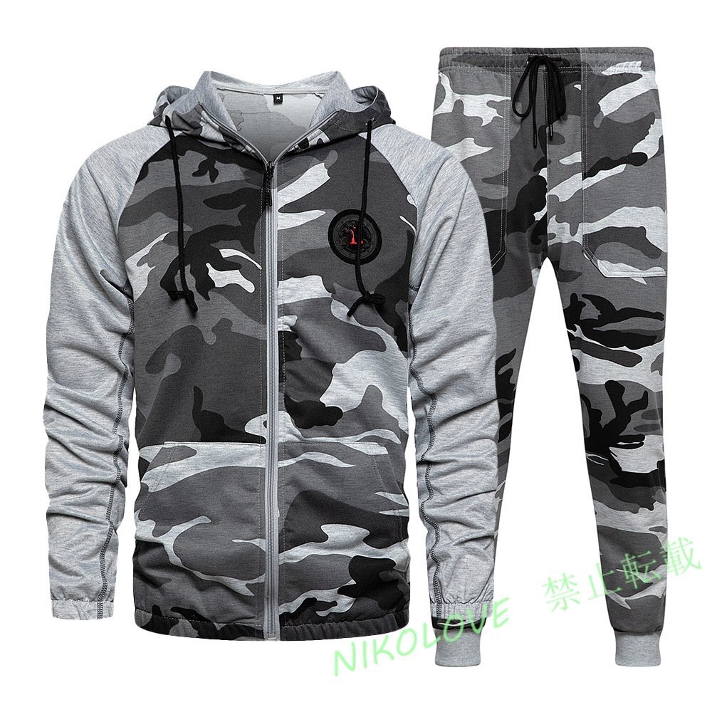 > ☆新品メンズジャージ 上下セット スウェット セットアップ パーカー トレーナー スポーツウエア 長袖 迷彩柄 S~2XL グレー