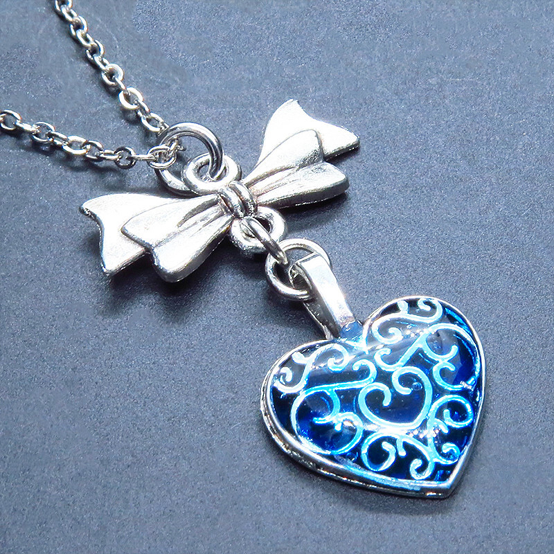 - アンティークシルバー アラベスク調の透かし模様のブルーハートとリボンのネックレス 長さ調整可