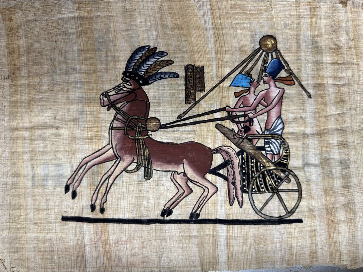 - 保管品 手書き★2頭立てチャリオット(戦闘用馬車) ラムセス2世夫妻 1980年代前半 エジプト パピルス 絵画 保管状態良好 40年保存 額無し