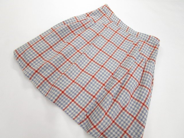 > 美品 クチュールブローチ couture brooch ひざ丈 タックフレアスカート 36 オフホワイト地 スカーレッド×パープル×ブルー チェック柄
