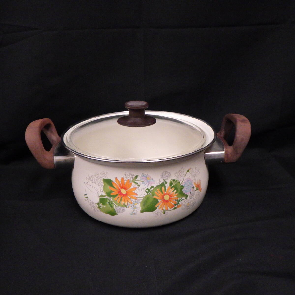 - 昭和 レトロ 鍋 花柄 ホーロー鍋 ガラス蓋付き アンティーク 両手鍋 花 NEOREX