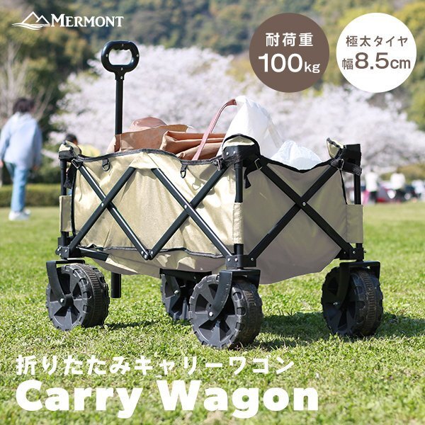 - 【ベージュ】新品 キャリーワゴン アウトドアワゴン 耐荷重100kg 折り畳み マルチキャリーカート 大容量 大型タイヤ レジャー mermont