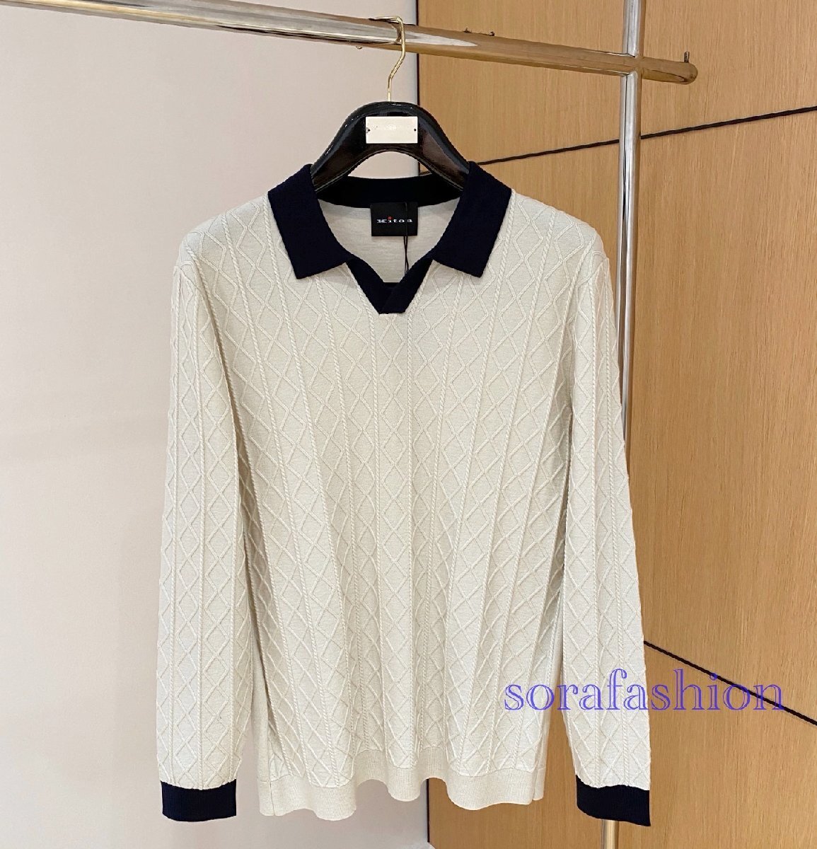 > KITON キトン メンズニットポロシャツ 長袖T-シャツ トップス ベージュ 56サイズ ニットカットソー 紳士服 ジャガード柄 通気吸湿