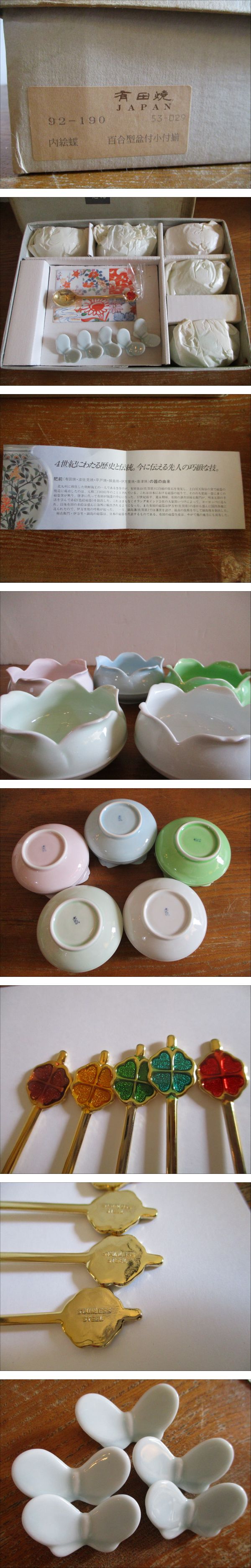 > 【未使用・箱入・レア】有田焼 JAPAN 百合型盆付小付揃 内絵蝶 5客セット 小鉢(5色)&盆&スプーン&スプーン置き 伝統工芸 デッドストック