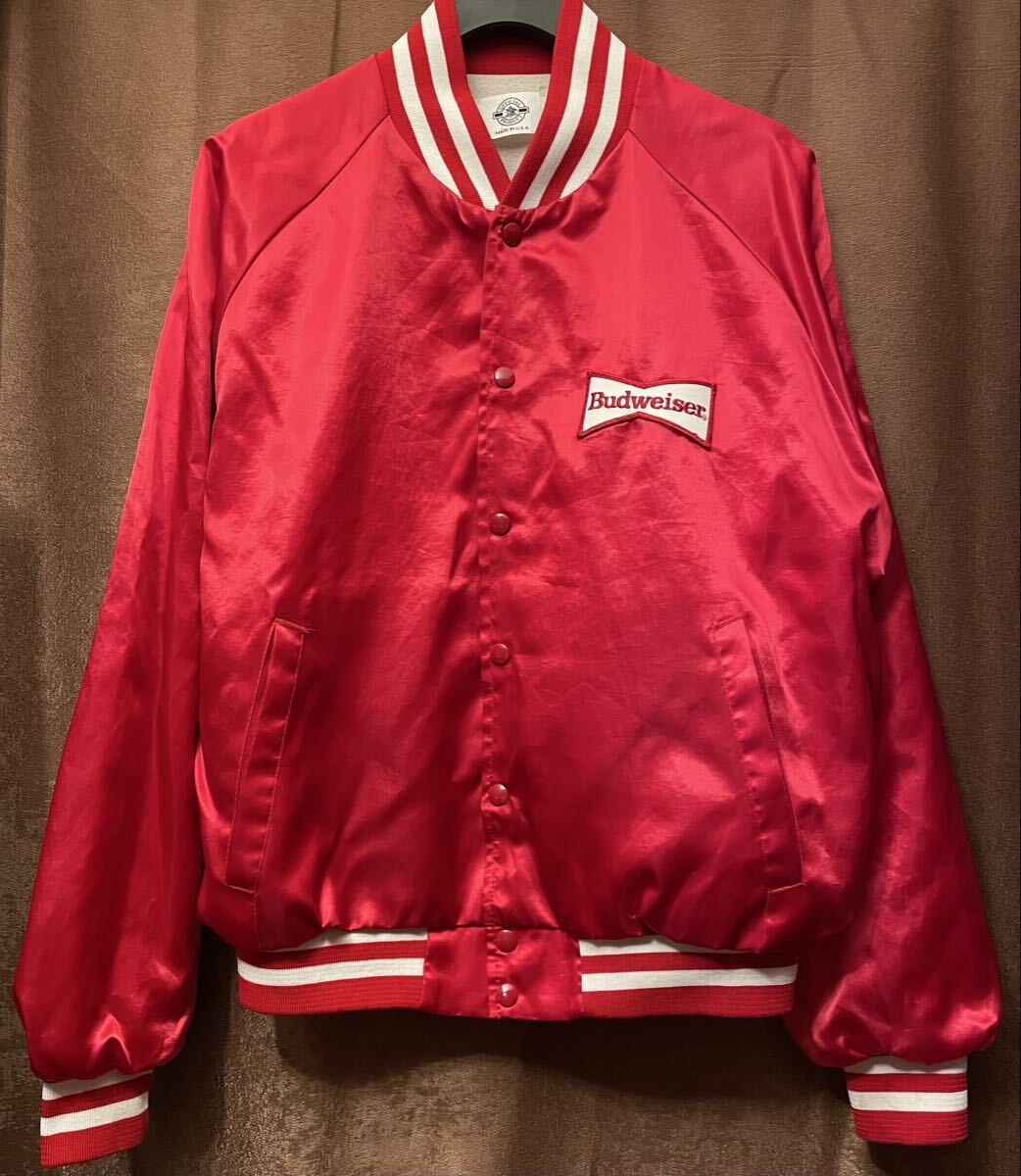 - MADE IN USA製 Budweiser サテンスタジアムジャケット レッド Lサイズ スタジャン バドワイザー ビール アメリカ製 米国製 アメリカ古着 赤