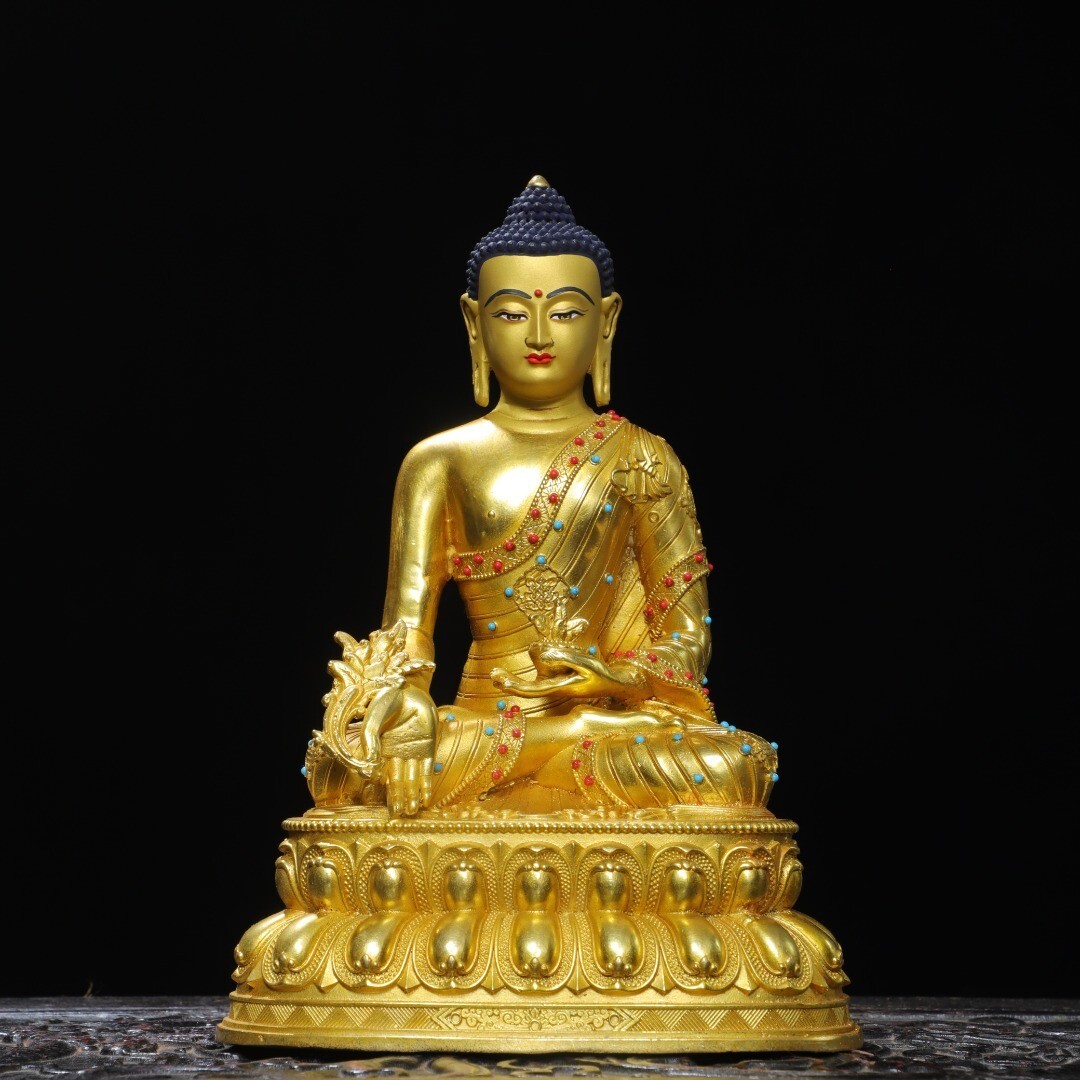 - 【永】明時代 塗金嵌寶石 藥師佛 佛像 仏像 宗教 仏教古美術 極細工 古銅彫 置物擺件 古美術品 時代物 古董品 収集 旧家蔵出 中国唐物 A22