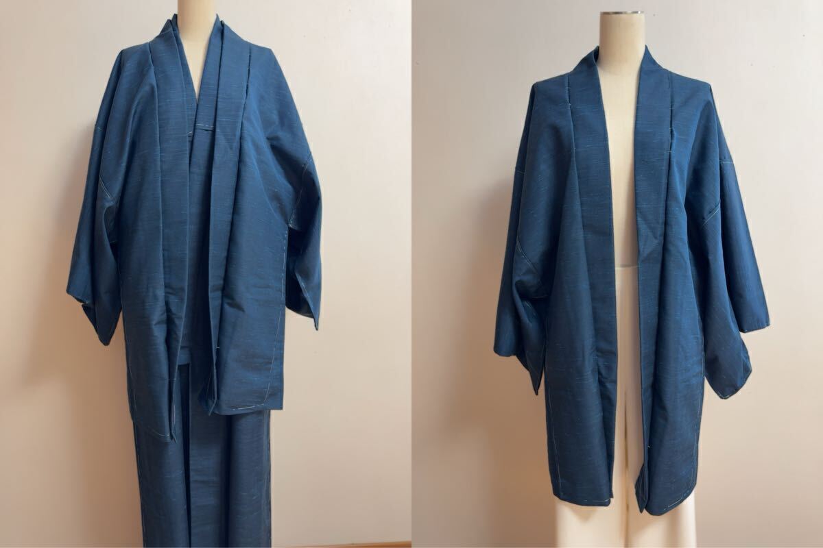 - き29 ○桝屋京染 羽織着物 生地 落款あり 和装・リメイクに ブルー系 しつけ付き