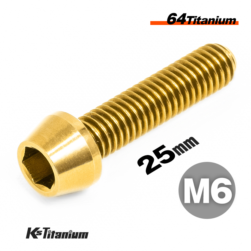 > チタンボルト M6×25 P1.0 ゴールド 64チタン テーパーボルト FULLスレッド 全ネジ チタン合金 バイク パーツ 自転車 軽量