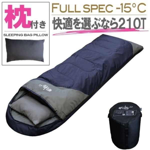 - 新品未使用 枕付き フルスペック 封筒型寝袋 -15℃ ネイビー