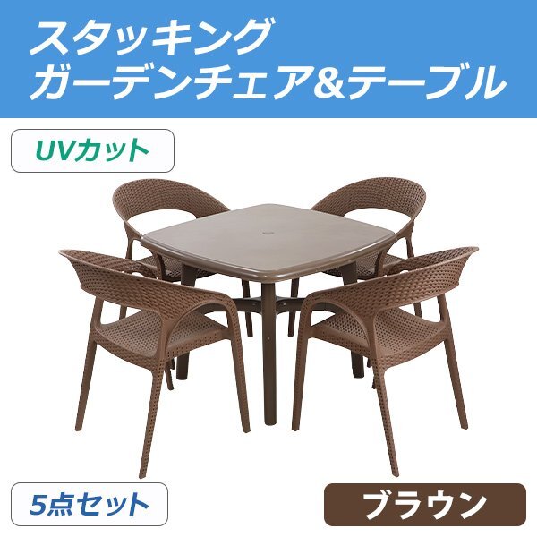 - 送料無料 プラスチックチェア ガーデンチェア ガーデンテーブル 5点セット UVカット ブラウン パラソル使用可 テーブル&チェアー4脚