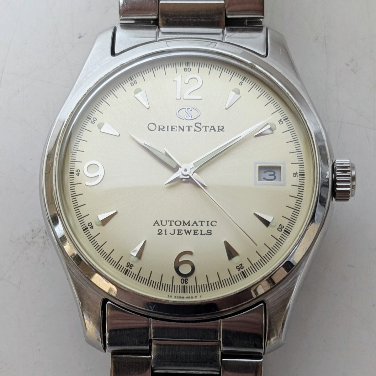> ORIENTSTAR AUTOMATIC 21J 48747 オリエントスター 21石 自動巻き アイボリー文字盤 Sマーク デイト 裏スケルトン メンズ腕時計 稼働品