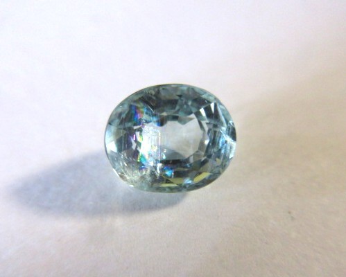 大変淡い水色のアクアマリンです。インクルージョンやクラックがあり、その加減でレインボーが少し出ています。透明感とテリがあります。非加熱。