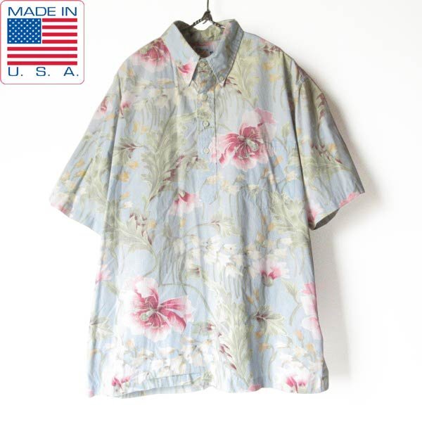 > 90s~ USA製 水着タグ レインスプーナー ボタニカル柄 半袖 アロハ シャツ XL プルオーバー 水色系 リバースプリント D152-04-0003ZV