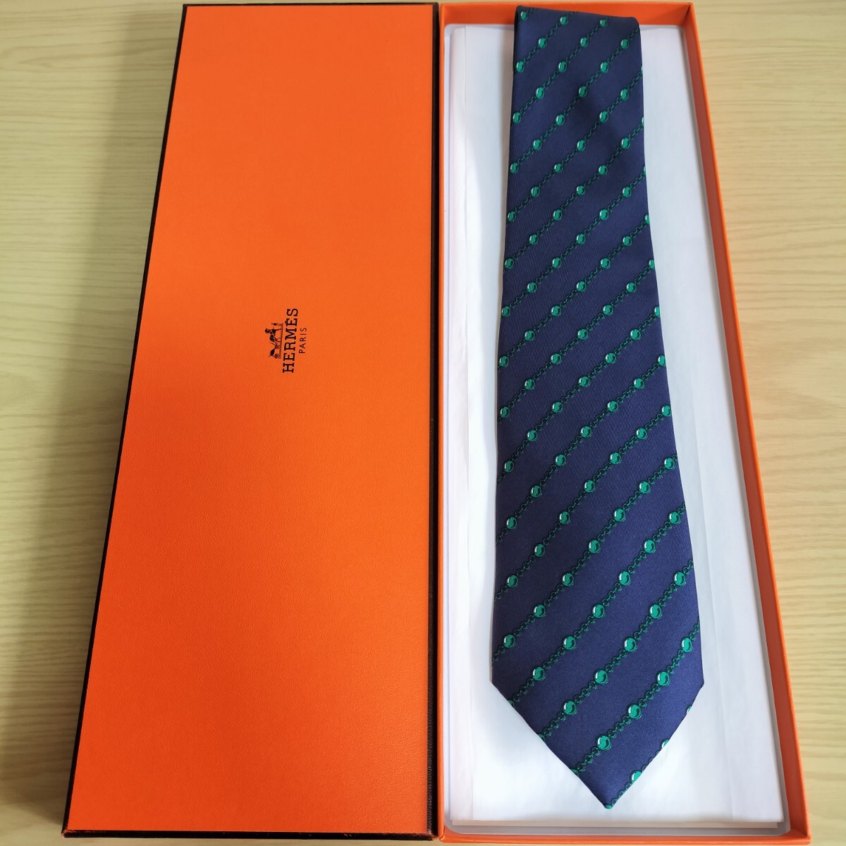 - エルメス(HERMES)紺色緑宝石ストライプ模様ネクタイ