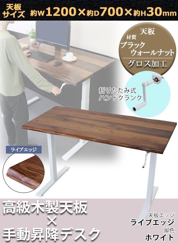 - 送料無料 昇降デスク 手動 W1200×D700×H735~1185mm ブラックウォールナット材 ライブエッジ 脚色 ホワイト 木製 天板 グロス加工