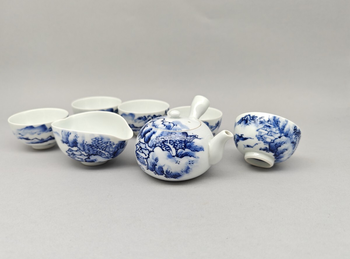 - 【懐】茶器 急須 湯冷まし 茶盃五客 細密手描風景図 時代染付 青華 青花山水図 煎茶道具 逸品 AF-094