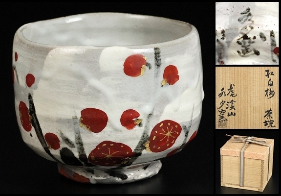 - 【 水月窯 】作 紅白梅茶碗 荒川豊蔵 虎渓山 共箱 保証
