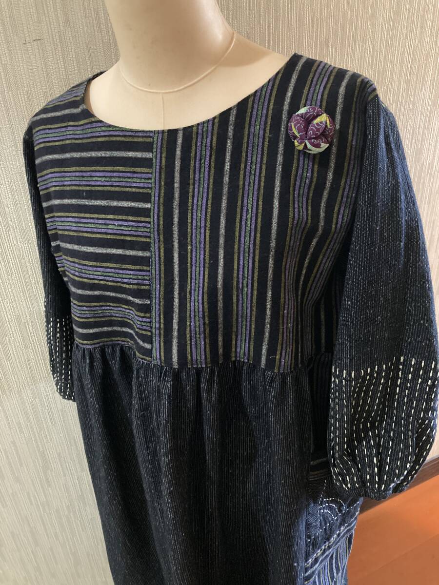 - 藍染縞木綿ワンピース刺し子入りハンドメイド&ブローチ付き