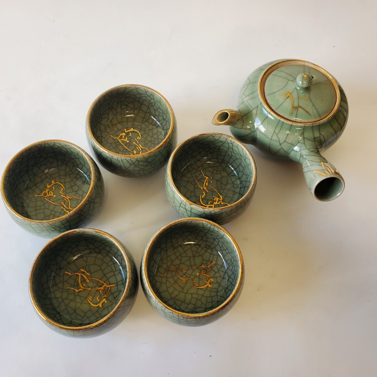- 青磁 金彩絵付 急須 湯呑5客 茶器セット 未使用 長期保管 和食器 茶道具