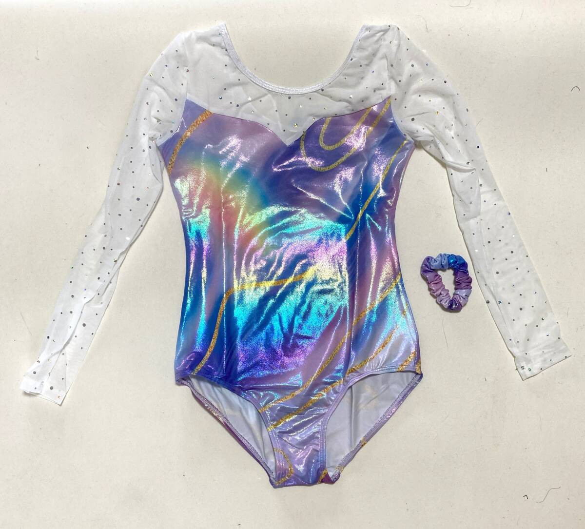 > US14サイズ/Poly Unicorn レインボーカラーロングスリーブ 長袖レオタードシュシュ付 ツルスベ メタリック キラキラ ラインストーン