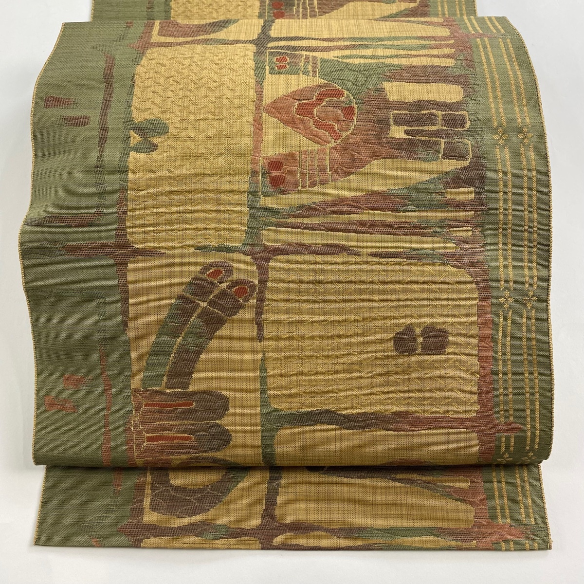 > 【美品】 名古屋帯 優品 松葉仕立て 八寸名古屋帯 紬地 幾何学模様 山吹茶色 正絹 【中古】