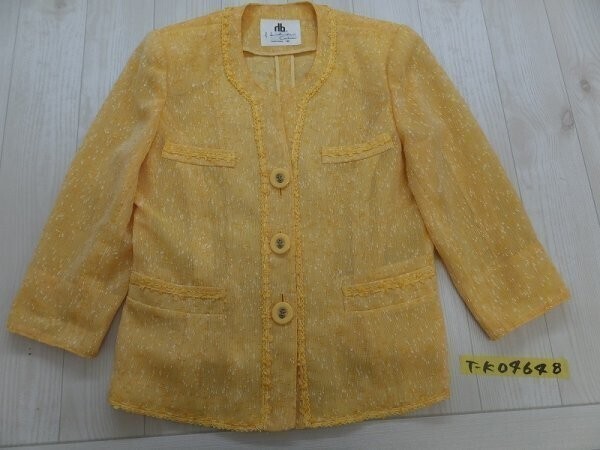 - 美品!Nb レディース 日本製 透けあり 肩パッド入 フラワーフリンジ 刺繍 ノーカラー 七分袖ジャケット 春夏 9AR 黄白