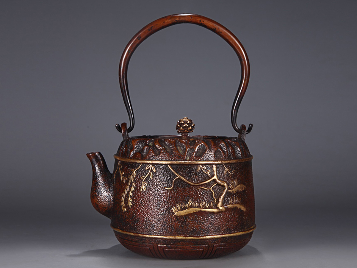 - ▽鴻▽明時代 古銅塗金彫刻 花卉紋湯沸 急須 茶壺 煎茶道具 時代物 中国古美術 骨董品