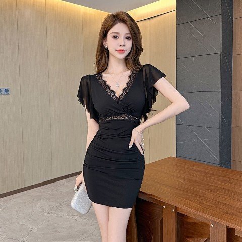 - キャバドレス キャバ嬢 ギャザ入り セクシー レース切替ミニ丈ドレスワンピース 3L ブラック