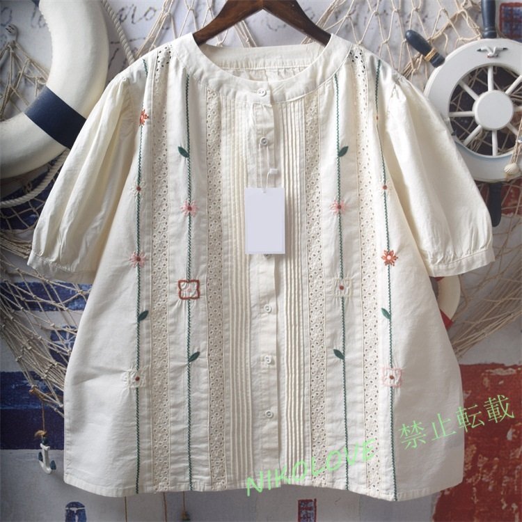 > ☆新品 刺繍花柄 半袖 チュニック ワイシャツ トップス 綿100% ゆったり オシャレ フリーサイズ ナチュラル ベージュ色