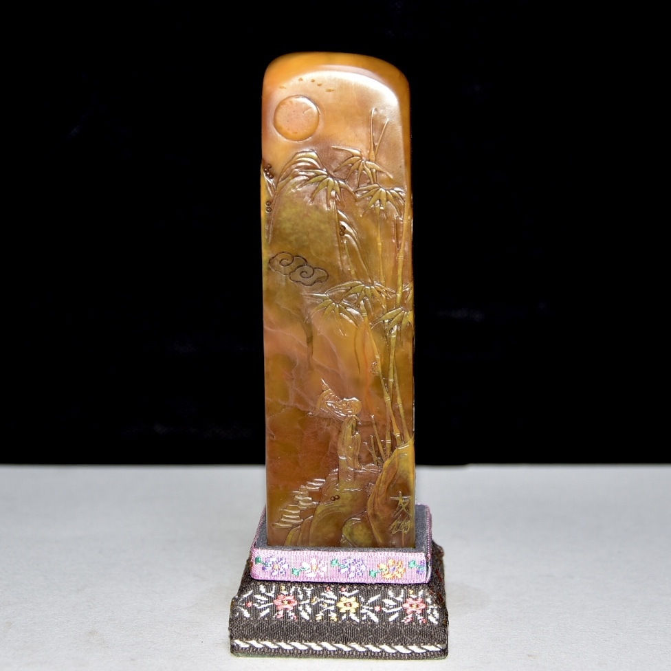 - ▽鴻▽清朝時代 寿山石 田黄石彫 人物竹節紋印章 友竹作 箱付 時代物 中国古美術 骨董品