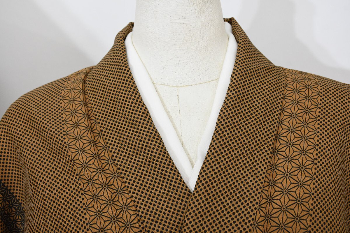- 小紋 着物 袷 麻の葉 ドット柄 丁字色 洗える着物 身丈160.5cm 裄丈66.5cm ★ kb-7392 桜庭呉服店