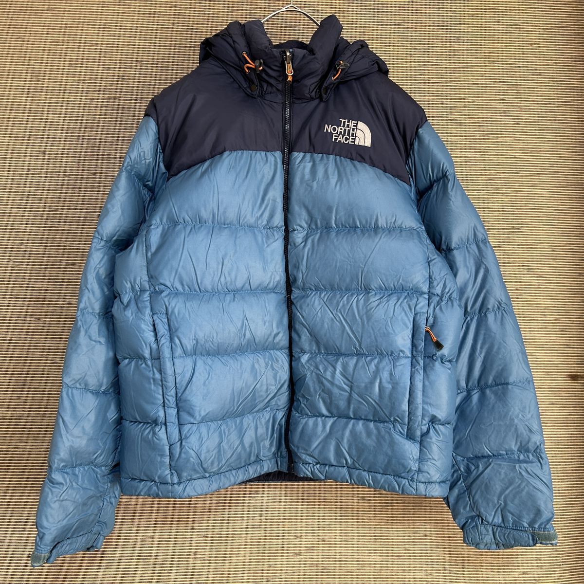 > ノースフェイス ダウンジャケット 水色ネイビー系 刺繍 ワンポイント C3 古着 入手困難 激レア 希少 人気 袖ロゴ スカイブルー